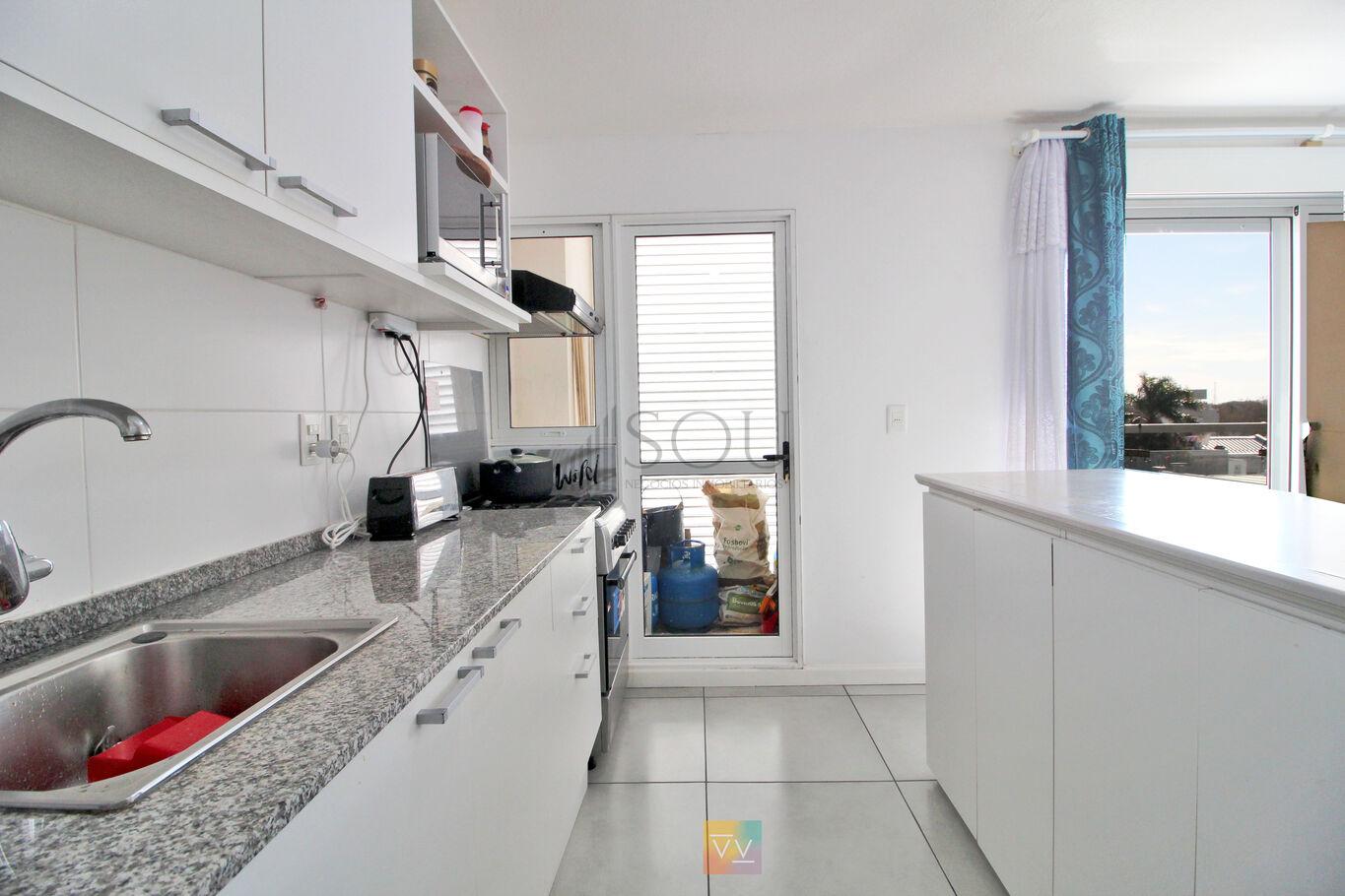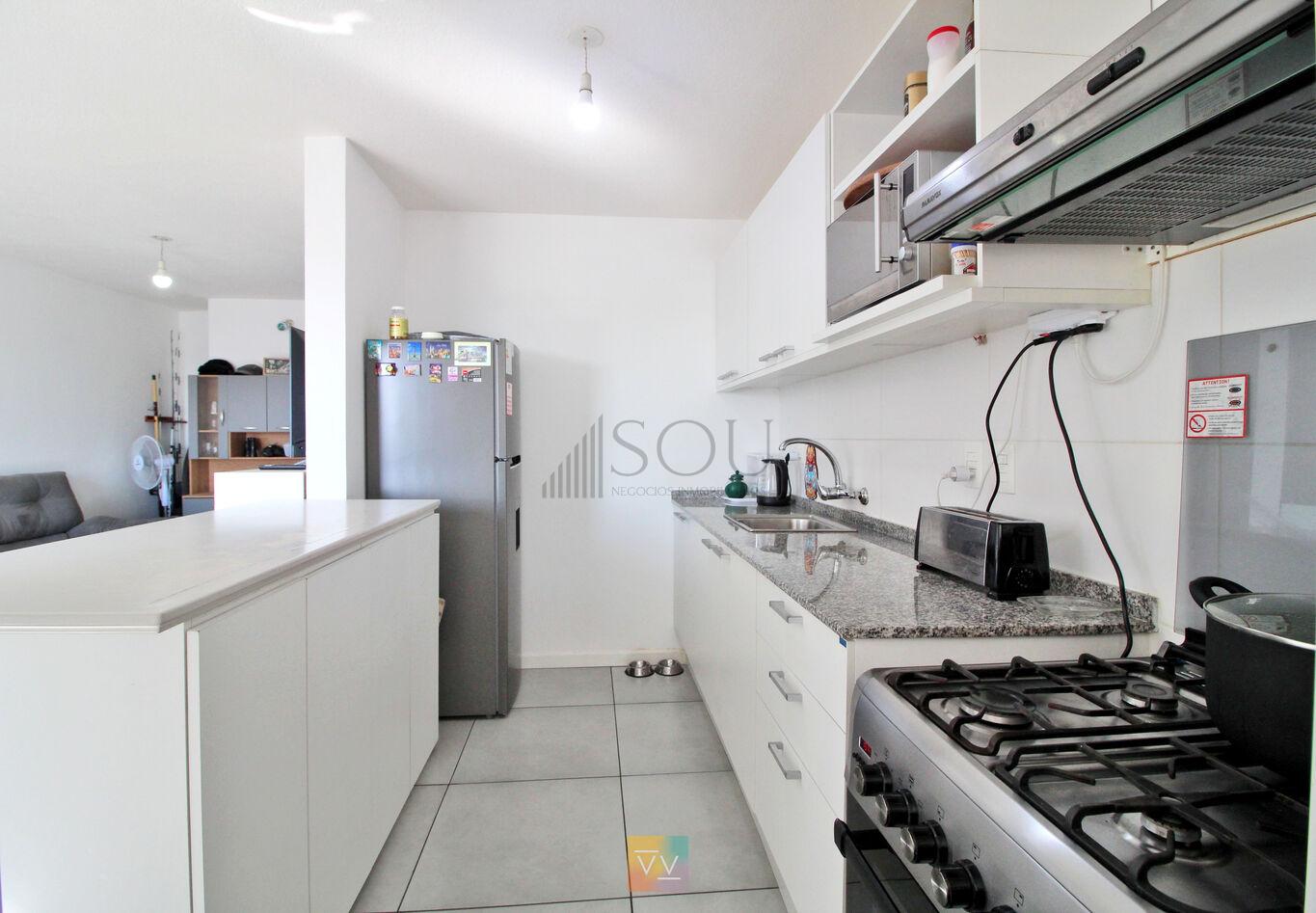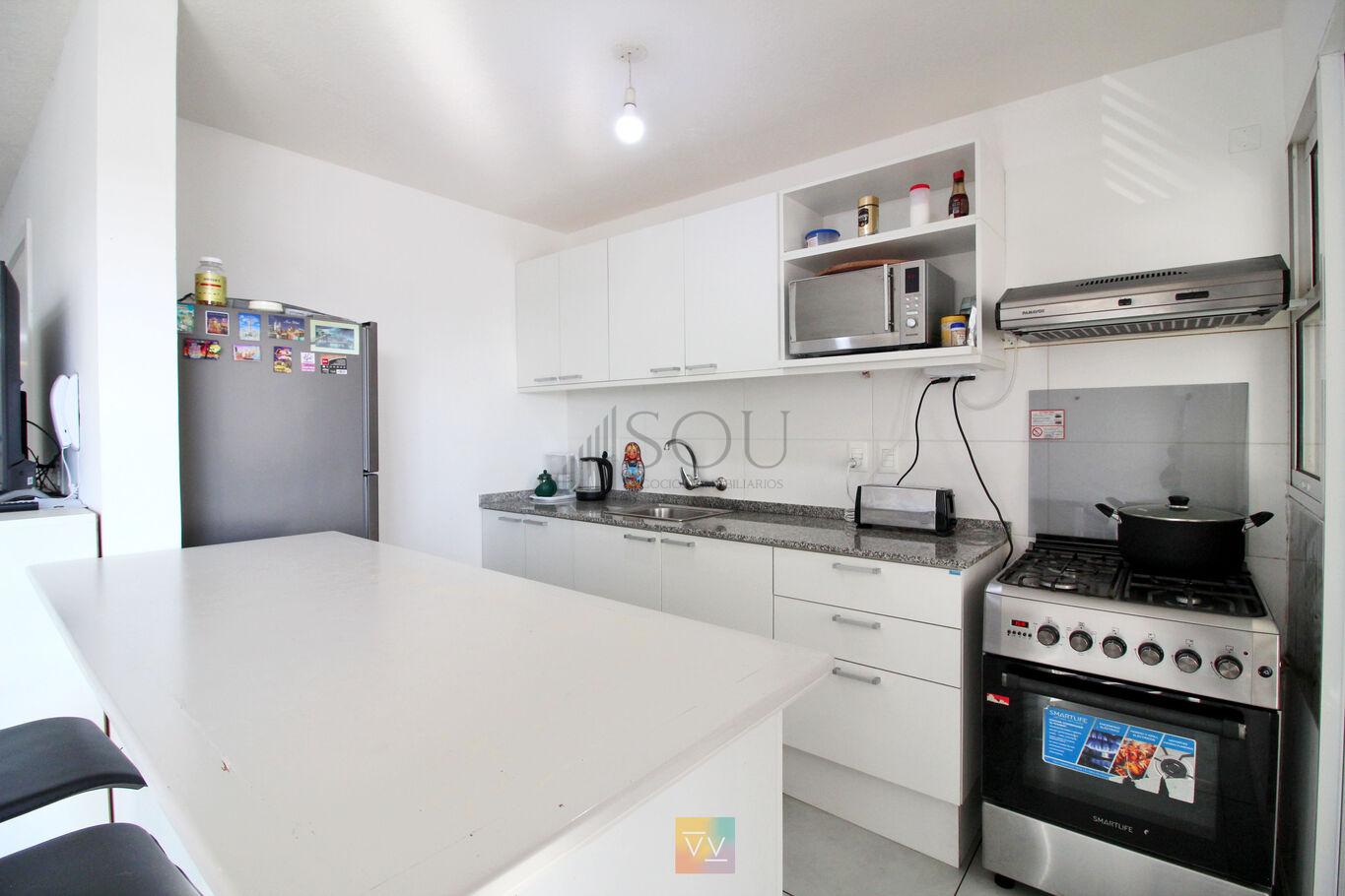 Cocina integrada con barra desayunadora, muebles aéreos y bajo mesada.